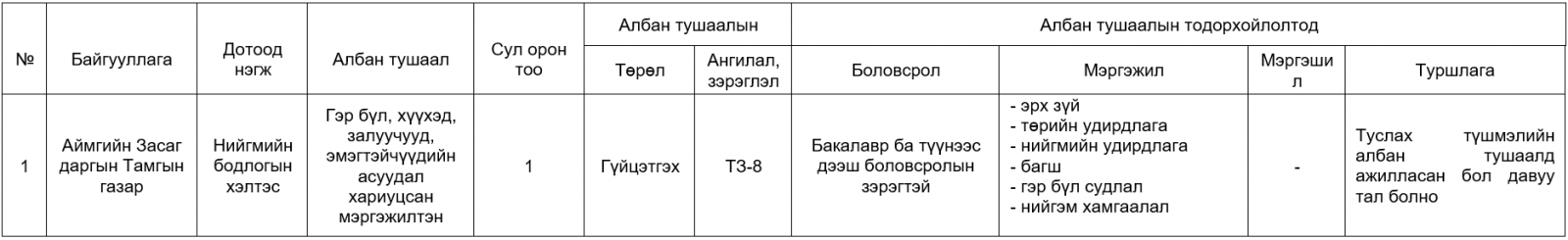 ТӨРИЙН ЖИНХЭНЭ АЛБАН ТУШААЛД ШИЛЖҮҮЛЭН АВАХ АЖЛЫН БАЙРНЫ ЖАГСААЛТ