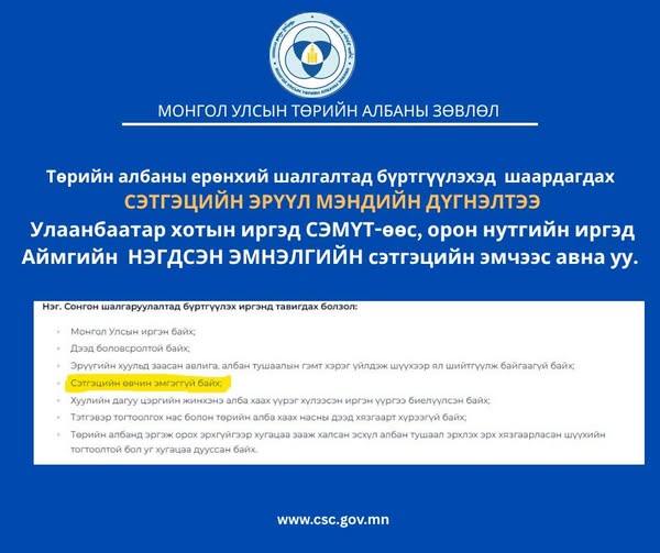 Төрийн албаны ерөнхий шалгалтад бүртгүүлэхэд тавигдах шаардлагын дагуу Улаанбаатар хотын иргэд Сэтгэцийн эрүүл мэндийн үндэсний төвөөс, орон нутгийн иргэд Аймгийн Нэгдсэн эмнэлгийн сэтгэцийн эмчээс сэтгэцийн эрүүл мэндийн дүгнэлтээ авна уу.
